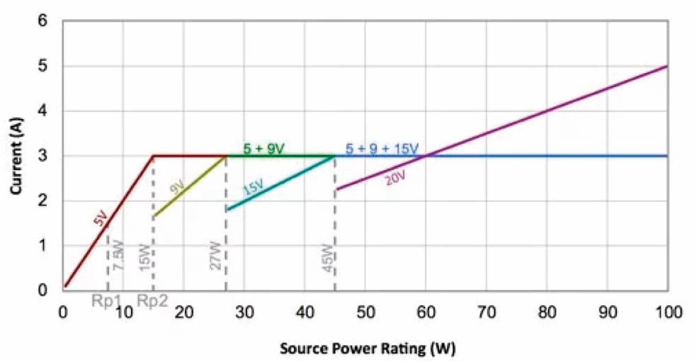 USB Power Delivery 2.0 introduced some changes to the way that power ratings between devices are handled, making the standard more flexible than before. The old set of Power Profiles were removed in PD 2.0 and replaced by Power Rules that allow for a wider range of current negotiations. The USB 3.1 specification adopted Power Profiles instead, but is only rated up to 15W rather than 100W. PD 3.0 made some tweaks to enhance power delivery, but the Power Rules are the same as PD 2.0 products. Rules are split into four target power categories; 7.5W, >15W, >27W, and >45W; each of which offers a range of voltage and current configurations. Sources supplying more than 15 watts offer voltages of 5 and 9 volts, those supplying more than 27 watts offer 5, 9 and 15 volts, and those supplying more than 45 watts offer 5, 9, 15 and 20 volts. The maximum 100W power supply is achieved with 20V and up to 5A, although all of the other modes cap out at 3A, depending on the required power.