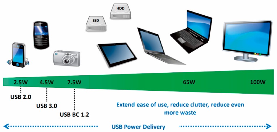One of the primary motivations behind the development of USB Power Delivery was to produce a single charging standard that could be used across all USB devices. The goal is to reduce e-waste in the future by removing the need for chargers with various ratings for different products. The standard is now on its 3.0 revision, but is backwards compatible with 2.0 products.
